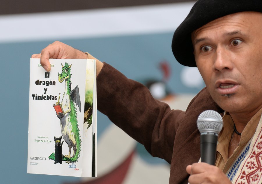 Durante la presentación, efectuada en el Foro Café y Letras, el cuentacuentos Itzihuape Escalera se dirigió a los niños y niñas para contarles sus impresiones del libro.