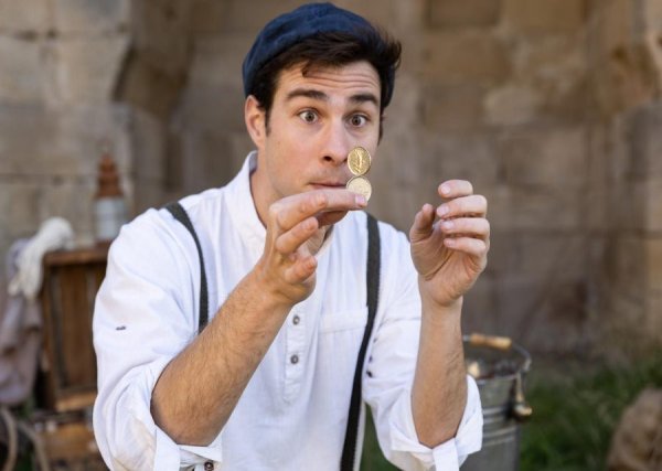El artista Txema Muñoz transforma la magia y el clown en un espectáculo poético sin palabras. Con humor, juego y asombro, crea un universo donde lo cotidiano se vuelve fantástico: tazas que aparecen, monedas inquietas y cucharas que brotan sin cesar. Una propuesta que mezcla mimo, clown y magia para guiar al público hacia un viaje de imaginación y emoción compartida.