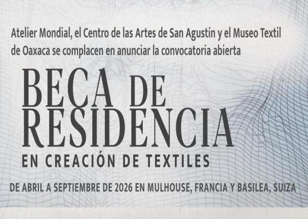 Esta es una convocatoria para la Beca de Residencia en Creación de Textiles organizada por el Atelier Mondial, el Centro de las Artes de San Agustín y el Museo Textil de Oaxaca.