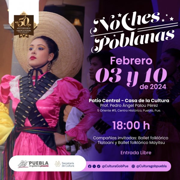 Las y los poblanos podrán disfrutar gratuitamente de presentaciones de danza regional, el cual consiste en presentaciones de las principales danzas regionales de la entidad y contarán con compañías invitadas como los Ballet Folklóricos “Tlatoani” y “Mayitsu”, por mencionar algunos.