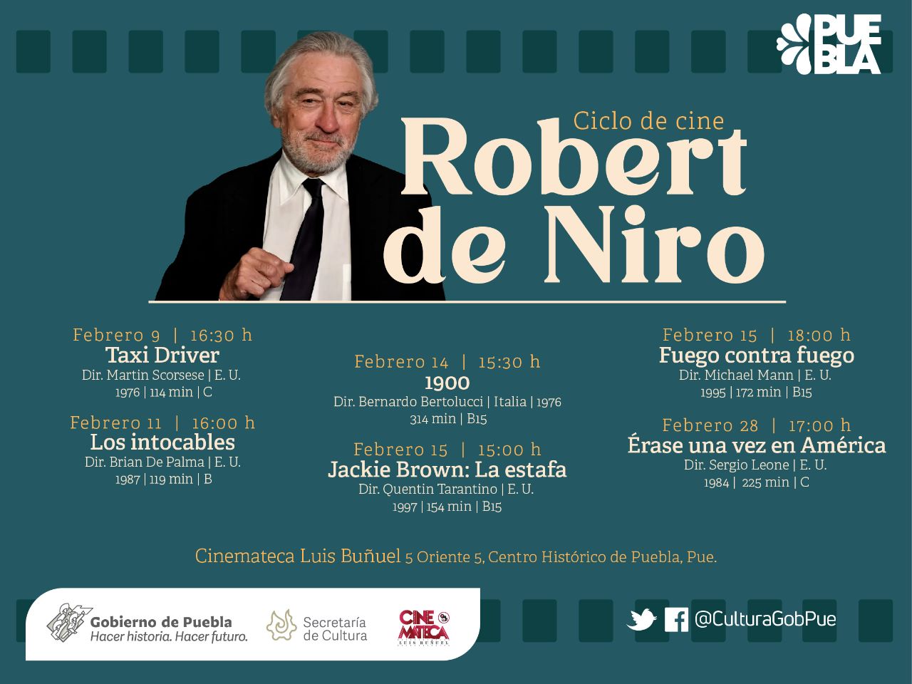 Por otra parte, la dependencia presentará en el ciclo de cine “Robert De Niro” las películas: “Taxi Driver”, “Los intocables”, “1900”, “Jackie Brown: La estafa”, “Fuego contra fuego” y “Érase una vez en América”, protagonizadas por dicho actor estadounidense, acreedor de dos Premios Óscar y dos Globos de Oro (entre otros galardones) a lo largo de su trayectoria.