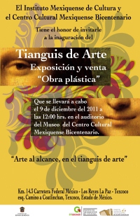Con la finalidad de promover la creación de los artistas locales y al mismo tiempo impulsar su labor, el Instituto Mexiquense de Cultura, con el apoyo del Consejo Nacional para la Cultura y las Artes, realiza el primer Tianguis de Arte en el Centro Mexiquense Bicentenario en la comunidad de Texcoco.