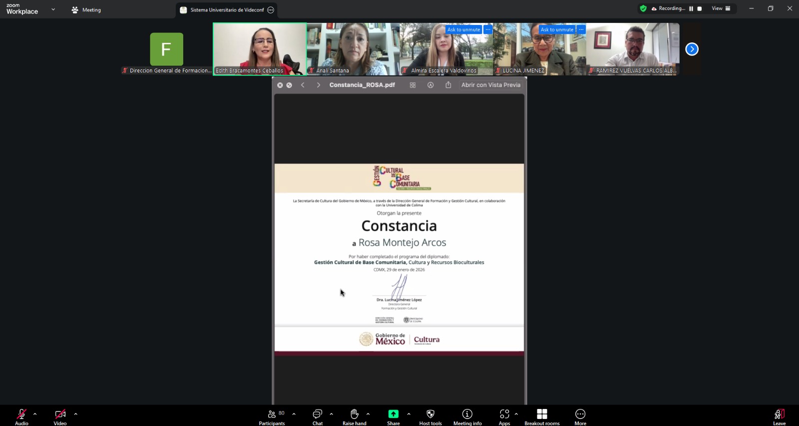 Organizado por la Secretaría de Cultura del Gobierno de México, a través de la Dirección General de Formación y Gestión, en colaboración con la Universidad de Colima, mediante la Coordinación General de Extensión, el Diplomado “Gestión Cultural de base comunitaria. Cultura y recursos bioculturales” concluyó sus actividades con una ceremonia de clausura en línea, la tarde del 29 de enero de 2026.