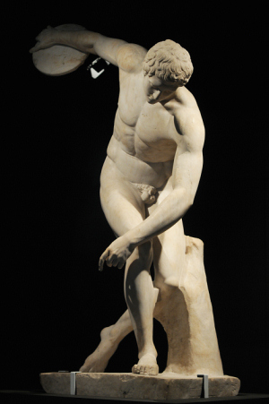 El recorrido de Cuerpo y belleza en la Grecia Antigua inicia con una de las copias más valiosas del Discóbolo, de Mirón, esculpida en el siglo II y conocida también como el Lanzador de Disco.